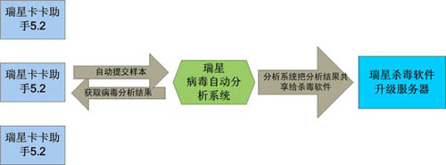 瑞星新建成的“病毒自動(dòng)分析系統(tǒng)”,采取“自動(dòng)診斷-自動(dòng)處理-即時(shí)升級(jí)”的策略,安裝了瑞星卡卡助手之后,無需用戶進(jìn)行任何操作,其中集成的“自動(dòng)診斷”模塊即可將電腦中的可疑文件提取并傳送到瑞星的服務(wù)器上,然后進(jìn)入“病毒自動(dòng)分析系統(tǒng)”進(jìn)行處理,并將結(jié)果瞬時(shí)反饋給用戶,瑞星卡卡即可清除掉大部分盜號(hào)木馬病毒,而相應(yīng)的分析結(jié)果也將同時(shí)提供給瑞星殺毒軟件。
