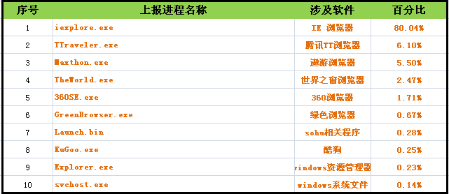 2009年上半年,瑞星“云安全”數(shù)據(jù)中心還記錄了訪問掛馬網(wǎng)站的進(jìn)程,以及利用不安全進(jìn)程訪問的掛馬網(wǎng)站數(shù)量。從下圖可以看出,使用瀏覽器訪問掛馬網(wǎng)站的數(shù)量最多,IE名列第一,騰訊TT和遨游緊隨其后。
