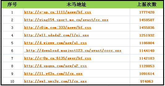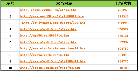 排行首位的木馬網(wǎng)站被攔截的次數(shù)70萬次;第二名的木馬網(wǎng)站被攔截次數(shù)為51萬余次;第十名的攔截次數(shù)也達(dá)到27萬余次。