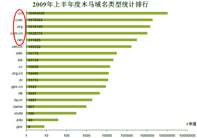 瑞星“云安全”數(shù)據(jù)中心截獲的數(shù)據(jù)表明,2009年上半年被攔截的木馬網(wǎng)站域名類型排行如下圖,排名第一是【.cn】,攔截量達(dá)10402029次,有67.8%的木馬網(wǎng)站使用CN域名,前五名中排名緊隨其后的域名依次為【.com】、【.org】、【.com.cn】、【.net】。