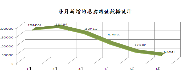 據(jù)瑞星“云安全”數(shù)據(jù)中心2009年上半年數(shù)據(jù)顯示,1月-6月新增的惡意網(wǎng)址數(shù)量為71765942個(gè),平均每個(gè)月新增的惡意網(wǎng)址數(shù)量為11960990個(gè),也就是說每天平均新增被掛馬url數(shù)量為398699個(gè)。