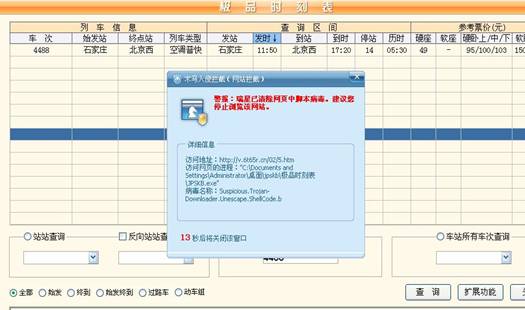 2009年3月9日,瑞星“云安全”系統(tǒng)提供的數(shù)據(jù)表明,網(wǎng)民中流行的“極品時刻表”軟件被黑客掛馬,截至當(dāng)天19時為止,瑞星已攔截到66757人次網(wǎng)民遭到攻擊。極品時刻表內(nèi)嵌的網(wǎng)頁被黑客植入木馬,當(dāng)用戶使用該軟件查詢列車車次時,就會遭到攻擊。