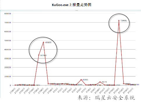 2009年2月25日,瑞星“云安全”監(jiān)測數(shù)據(jù)表明,酷狗被掛馬,當(dāng)天截獲到KuGoo.exe訪問掛馬網(wǎng)站的數(shù)量為337519,第二天2月26日為480800,那一次掛馬的“壽命”長達(dá)兩天,直到2月27日才清除了掛馬。3月14日通過KuGoo.exe進(jìn)程訪問掛馬網(wǎng)站數(shù)據(jù)量暴增,為724381,達(dá)到平時訪問量的30倍之多,那次掛馬持續(xù)了一天,3月15日被清除恢復(fù)正常,當(dāng)天顯示數(shù)量下降至18964。
