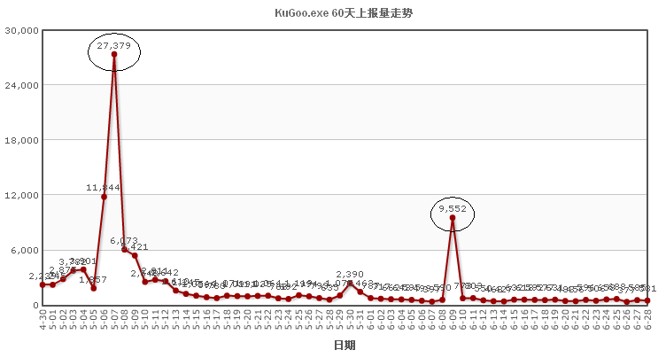 截止到6月29日,“云安全”數(shù)據(jù)中心顯示,酷狗網(wǎng)站在5月7日和6月9日仍有小范圍的被掛馬行為。(5月7日截獲到KuGoo.exe訪問掛馬網(wǎng)站的數(shù)量為27379,6月9日為9552)