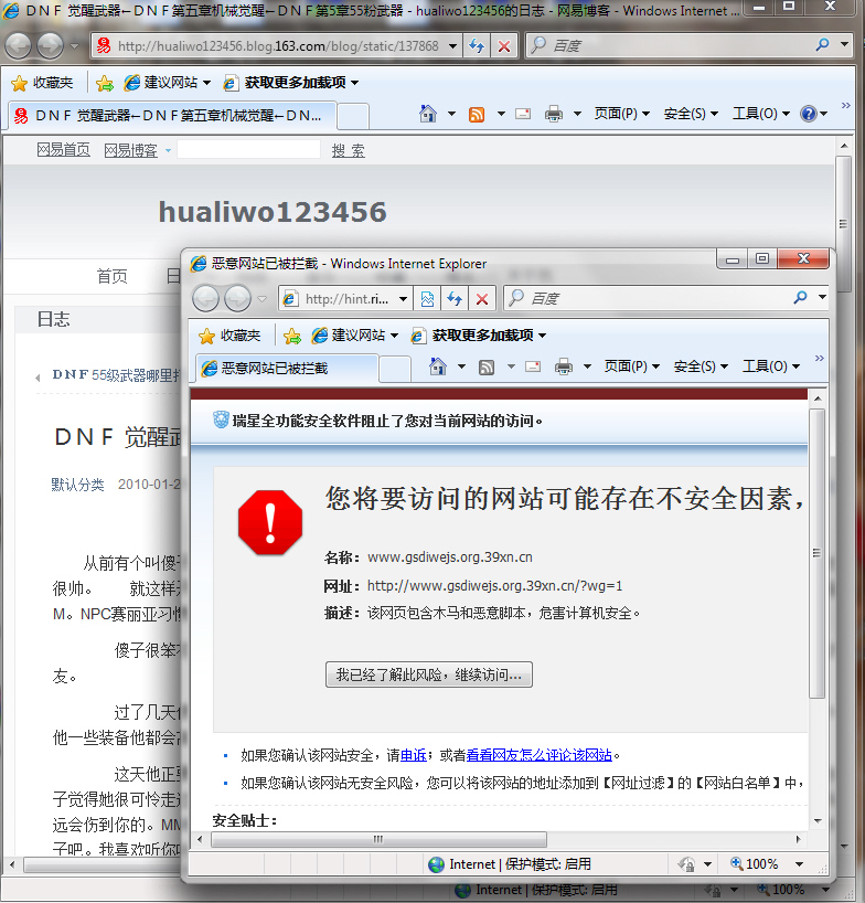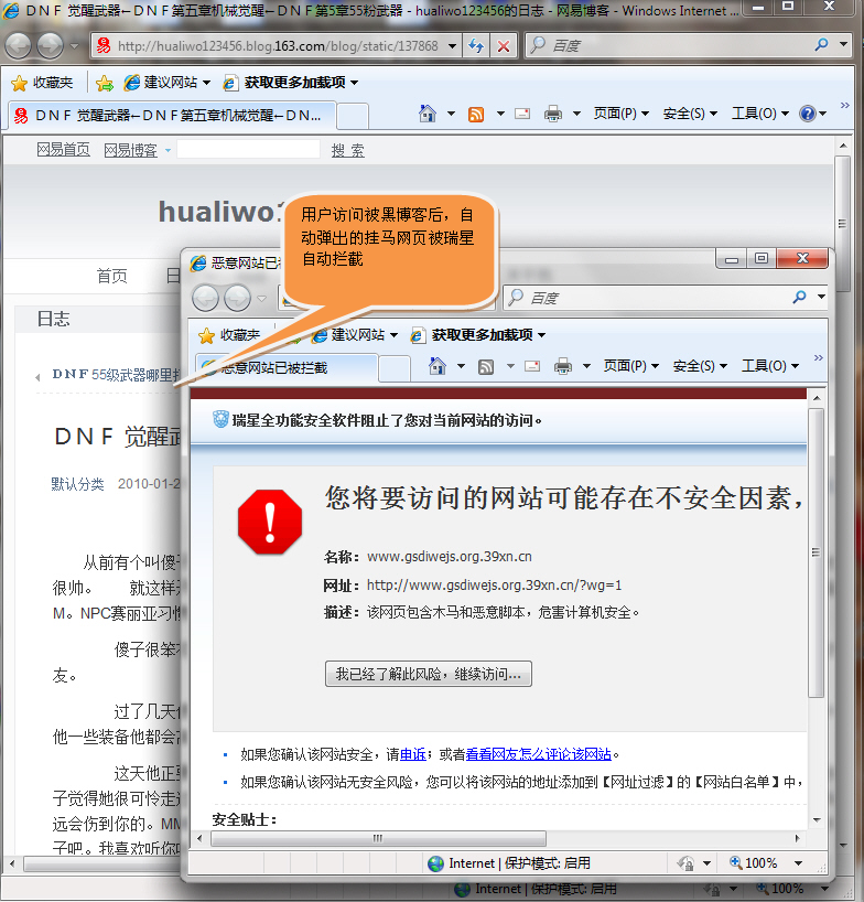 用戶訪問被黑博客后,自動彈出的掛馬網頁被瑞星自動攔截 |