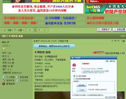 2010-02-26 15:11:04近日,“中國第一車模獸獸”爆出的不良視頻在網上大量傳播,已被黑客用來散布病毒。根據瑞星“云安全”系統的監測數據,很多用戶通過QQ 、MSN傳播的“獸獸視頻、獸獸視頻全集 .EXE ”含有病毒,或者本身就是病毒,還有的黑客會主動散播含毒的“獸獸視頻下載網址”,用戶中毒后會被竊取網游帳號、QQ 密碼等資料。預計受害網民已超過10萬。