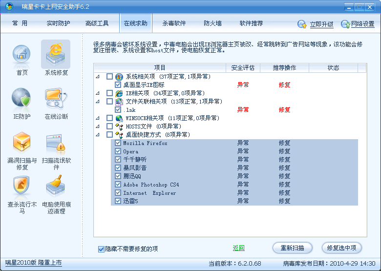 2、?已經感染病毒的用戶和使用其他殺毒軟件用戶在殺毒后無法正常運行桌面快捷方式時,下載瑞星卡卡上網安全助手,點擊“系統修復”后,自動修復桌面正常。
