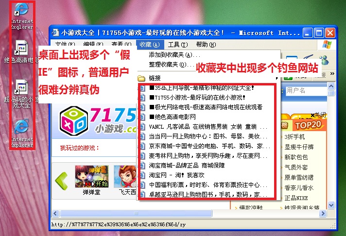 “世界杯木馬”運行后,會在電腦桌面和IE收藏夾中生成十多個釣魚網站和惡意導航網站,還會在桌面上生成假IE圖標迷惑用戶,并且無法直接刪除。用戶點擊后就會為這些網站帶來巨大流量,而且會因為訪問釣魚網站致使用戶的個人隱私、銀行賬號等信息被盜。