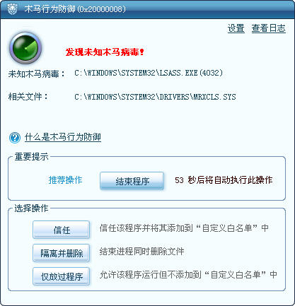 3.?安裝瑞星殺毒軟件(http://www.ikaka.com/2010/down.asp?t=ravd&action=1471771),升級到最新版本,即可徹底查殺該病毒的所有已知變種。并強烈建議開啟“木馬行為防御”功能,該功能采用動態分析技術,可以全面攔截該病毒的未知變種。