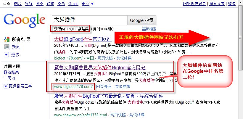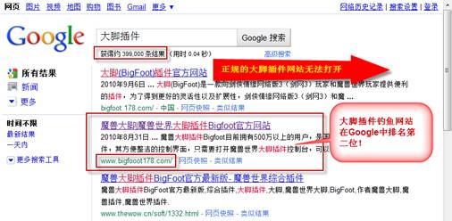 瑞星安全專家介紹說,當網民搜索“大腳插件”(一種熱門魔獸輔助工具)時,帶有該病毒的網站排在Google搜索引擎的第二位。真正大腳插件的官方網站是bigfoot.178.com,假網站為“www.bigfooot178.com”,普通網民很難分辨這兩個域名的區別。由于真網站處于無法打開的狀態,很多網民順理成章的就去訪問了帶毒的假網站,從假網站下載的大腳插件捆綁了魔獸盜號木馬。
