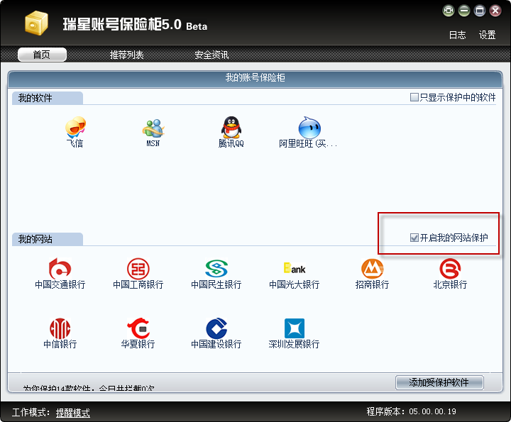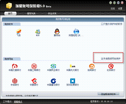 瑞星賬號保險柜5.0的一大主打功能就是有效保護各類網上銀行的賬號密碼安全。用戶只需在打開的主界面內,選中“開啟我的網站保護”,下方用戶經常使用的各種網頁版網銀就會被保護。當我們想在某個銀行進行交易時,在銀行列表中雙擊該銀行圖標就可以了,保護網絡銀行不受網絡釣魚和木馬的安全威脅。