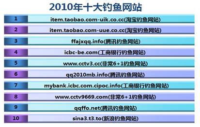 2010年,瑞星截獲釣魚網站175萬個(以URL計算),比去年同期增加1186%。受害網民4411萬人次,間接損失超過200億元。本年度騙人最多的釣魚網站(URL)是item.taobao.com-uik.co.cc,年度十大釣魚網站如下表: