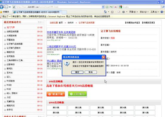有些不良的在線觀看網站借助安裝本站專用網站的機會誘使用戶安裝病毒,甚至以“本站播放的是盜版電影,會遭到瑞星等軟件攔截”等為由誘使用戶關閉殺毒軟件。年初發現的虎虎生威系列病毒變種就是以QVOD播放器下載為誘餌傳播的。