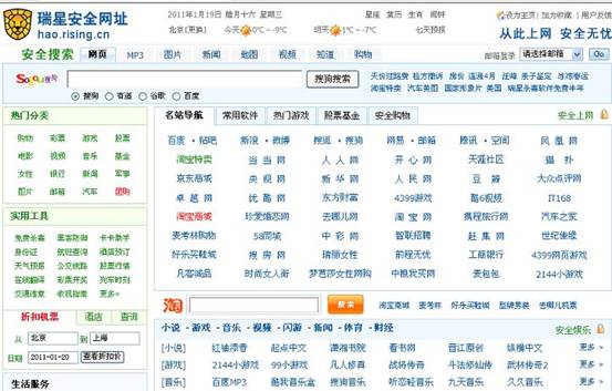 2011-01-19 11:07:23近日,以“安全”為特點的瑞星安全網址正式推出(http://hao.rising.cn/),該網站針對目前泛濫的釣魚網站、掛馬網頁等網絡威脅而專門設計,集合了網民常用的軟件下載、網游、網銀、炒股等多個常用網址,并且對所有網址都進行了徹底檢查,保證無毒無木馬無釣魚,用戶可以放心使用。