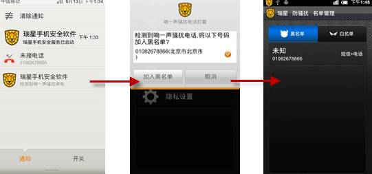 2、防騷擾-攔截騷擾電話:在很多情況下,騷擾電話往往在接通后馬上掛斷,如果用戶回?fù)芎螅a(chǎn)生高額話費(fèi)。瑞星騷擾電話攔截功能會(huì)快速識(shí)別,當(dāng)檢查到鈴響一聲電話時(shí),會(huì)提醒用戶,用戶如果選擇加入黑名單后,該電話號碼就會(huì)自動(dòng)保存,防止以后再次接到。