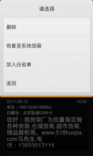 當(dāng)然,如果用戶認(rèn)為自己需要此條短信時(shí),可以在“攔截記錄”中點(diǎn)擊該條信息,然后選擇“恢復(fù)到系統(tǒng)信箱”,這樣,短信就恢復(fù)正常了,如果希望對該號碼今后發(fā)送的短信全部放行,可以直接點(diǎn)擊“加入白名單”,這時(shí)瑞星還會(huì)非常人性化的提醒,可自動(dòng)將加入白名單的所有短信自動(dòng)恢復(fù)到系統(tǒng)信息,簡化了用戶操作。