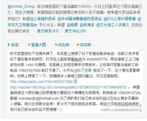 2011-07-08 10:38:17“我在網上搜索了松下空調的網站,然后去叫人來修,隔天就有人來修了。然后他自稱是總部派人來修的,說淋浴器的一個電腦版壞了,維修費用是650,交完錢就走了。走后發現,并沒有修好”有網民在百度貼吧里稱,自己在搜索引擎上搜到了松下的假售后網站,被騙走數百元。