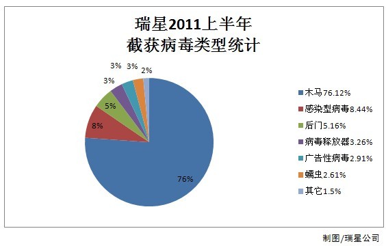 2011年上半年,瑞星“云安全”系統(tǒng)共截獲新增病毒樣本5,286,791個,病毒總體數(shù)量與去年同期相比上升25.2%。其中木馬病毒4,024,499個,占據(jù)總體病毒比例的76.12%,緊隨其后的病毒依次為感染型病毒(win32)、后門、病毒釋放器(Dropper)和廣告程序。
