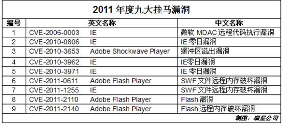 瑞星公司統計了黑客用來掛馬的9大漏洞,存在漏洞的軟件集中在瀏覽器和flash插件上,其中5個漏洞與IE有關,3個與Adobe Flash Player有關。Flash作為一種純網絡化、跨平臺的應用,其在移動平臺上的安全風險也不可低估,例如在安卓系統上,就有可以被利用來進行掛馬的Flash漏洞,隨著智能手機、平板運算能力的增加,未來可能在移動平臺出現大量的掛馬攻擊。