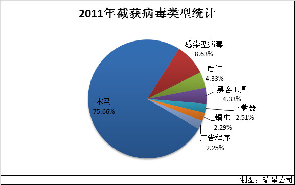 報告期內,瑞星公司截獲病毒922萬個,比去年上升22.9%,受害網民11.7億人次。從本年度新增病毒的種類來看,木馬(trojan)共有7,087,420個,占75.66%,當之無愧成為所有惡意程序中最大的類別。