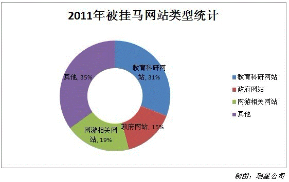 根據瑞星公司提供的數據,2011年有199,665個企業網站曾被成功入侵(以頁面計算),教育科研網站、網游相關網站和政府網站,是最容易被攻擊植入木馬的三種類型,分別占總體數量的31%、19%和15%。