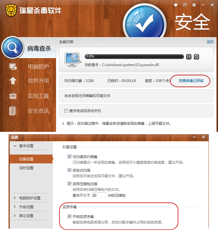 瑞星2012版以瑞星最新研發的變頻殺毒引擎為核心,通過變頻技術使電腦得到安全保證的同時,又大大降低資源占用,讓電腦更加輕便。從而解決了“電腦殺毒干不了別的,干別的殺不了毒”的難題。
