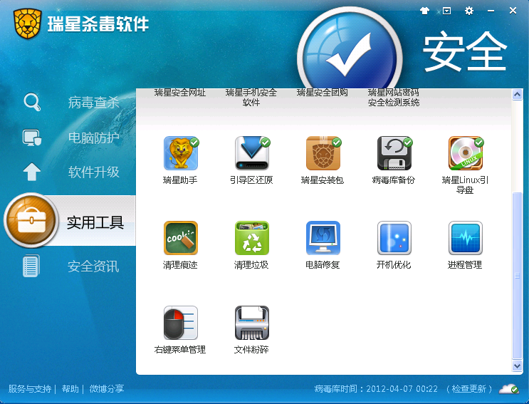 近日,瑞星殺毒軟件2012進行了再次更新,除了對現有的“變頻殺毒”技術進行了改進,還新增了電腦修復、開機優化、垃圾清理、進程管理等7項實用功能,為不同用戶提供了個性化的電腦安全解決方案。