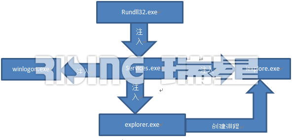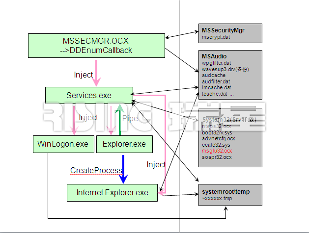 病毒主體為一個DLL動態(tài)庫,文件名為MSSECMGR.OCX。通過命令行rundll32.exe MSSECMGR.OCX, DDEnumCallback 加載病毒。病毒運行后會將自身復制到System32目錄下。病毒運行后會向services.exe、winlogon.exe、explorer.exe和iexplore.exe中注入自身并加載。