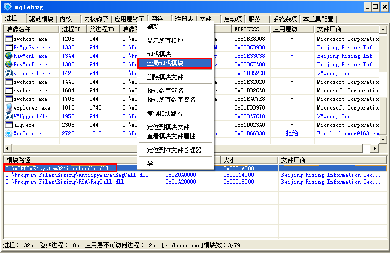 5)右鍵點(diǎn)擊explorer.exe下加載的iconhandle.dll,將其全局卸載。(如圖6)