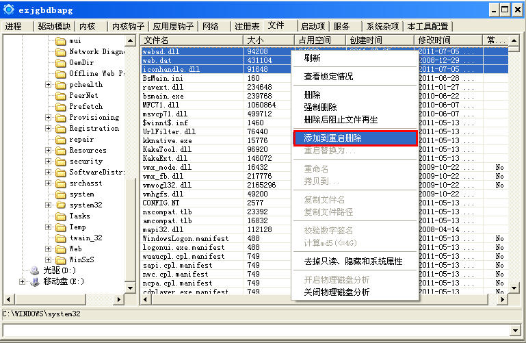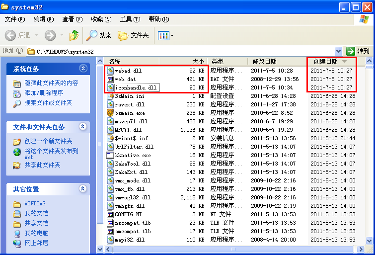 4)?找到該文件所在目錄C:\WINDOWS\system32,并利用“創(chuàng)建日期”排列該目錄下所有文件查看詳細(xì),這時(shí)發(fā)現(xiàn)了意外收獲:該目錄下的webad.dll和web.dat兩個(gè)文件與iconhandle.dll的創(chuàng)建時(shí)間相同,再仔細(xì)檢查一下你會(huì)發(fā)現(xiàn)web.dat文件大小為421KB,與U盤下的兩個(gè)病毒文件夾大小一致!且正常系統(tǒng)中C:\WINDOWS\system32路徑下原本就不存在這三個(gè)文件,由此可以推斷三個(gè)文件都是由病毒創(chuàng)建,可以全部刪除。(如圖5)