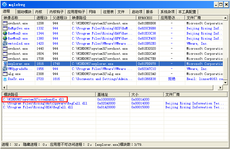3)?為檢查病毒文件是否還會(huì)再生,用XueTr工具對(duì)移動(dòng)磁盤進(jìn)行刷新操作,這時(shí)會(huì)發(fā)現(xiàn),兩個(gè)病毒文件又出現(xiàn)了,據(jù)此分析系統(tǒng)中還有殘余的病毒文件仍在加載,并不停地向U盤中創(chuàng)建后綴為.exe的文件夾。為了徹底清除病毒文件,再回到進(jìn)程中逐一檢查系統(tǒng)當(dāng)前所有進(jìn)程下加載的文件后,發(fā)現(xiàn)explorer.exe下掛有可疑模塊iconhandle.dll,且無數(shù)字簽名。(如圖4)