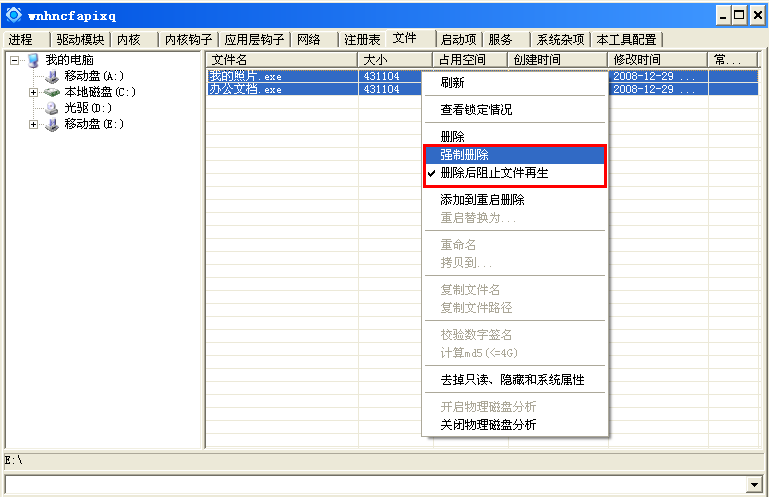2)?利用XueTr工具強(qiáng)制刪除U盤中的兩個(gè)病毒文件“我的照片.exe”和“辦公文檔.exe”,注意勾選“刪除后阻止文件再生”。(如圖3)