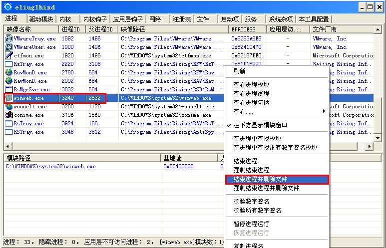 1)?查找并結(jié)束系統(tǒng)中明顯的異常進(jìn)程winweb.exe,右鍵將其選中,并選擇“結(jié)束進(jìn)行并刪除文件”操作。(如圖2)
