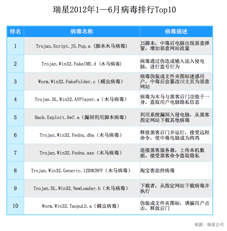 2012年1至6月,共計(jì)7.4億人次網(wǎng)民被病毒感染,平均每天411萬人次網(wǎng)民中毒,按感染人數(shù)、變種數(shù)量和代表性進(jìn)行綜合評(píng)估,瑞星評(píng)選出了2012年上半年的十大病毒。