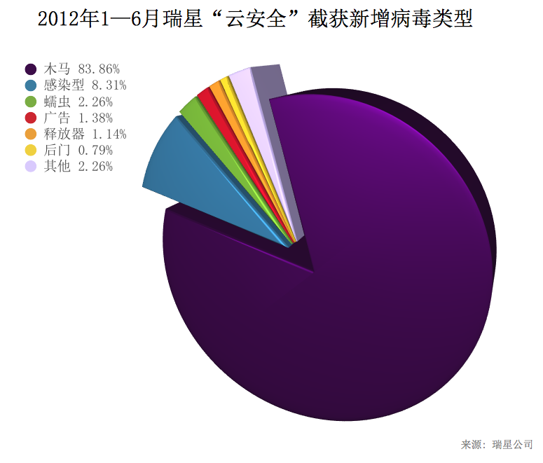 2012年1至6月,瑞星“云安全”系統(tǒng)共截獲新增病毒樣本3,349,373個(gè),其中木馬病毒2,808,723個(gè),占據(jù)總體病毒比例的83.86%。 從表面上看,病毒疫情似乎處于“風(fēng)平浪靜”的狀態(tài),但實(shí)際上病毒將其破壞行為轉(zhuǎn)變?yōu)椤暗叵虏僮鳌保脩魝鹘y(tǒng)觀念中的中毒后“電腦死機(jī)”、“無法上網(wǎng)”等現(xiàn)象不再是主流病毒采用的方式。64位操作系統(tǒng)、蘋果Mac操作系統(tǒng)均不斷遭受病毒攻擊,以往用戶心目中相對(duì)安全的系統(tǒng)的概念不復(fù)存在。