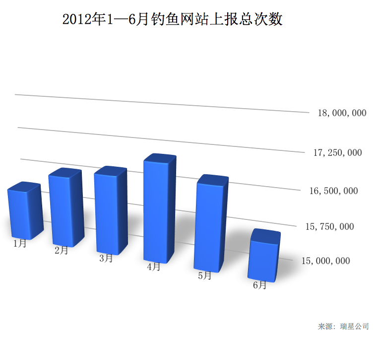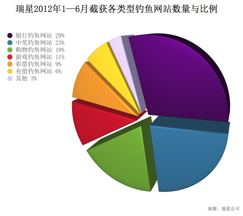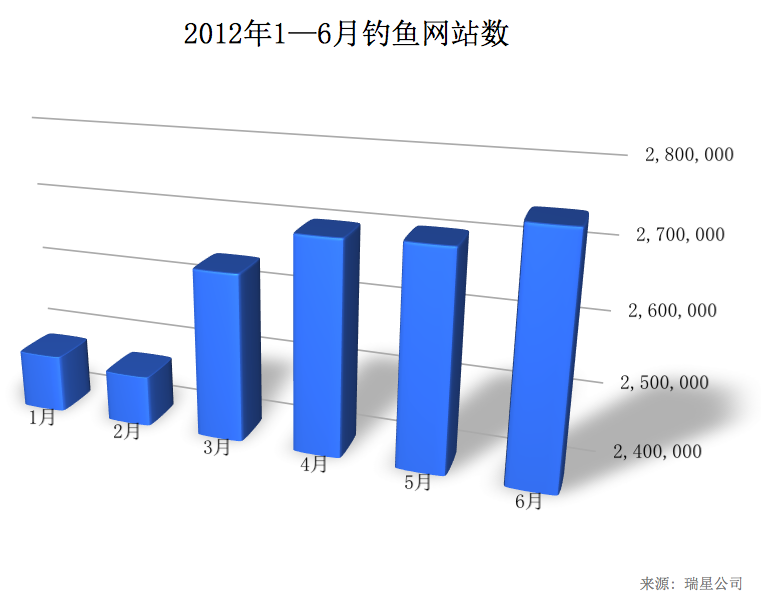 2012年1至6月,瑞星截獲釣魚網站315萬個(以URL計算),是去年同期的1.3倍;共 9,903萬人次網民遭釣魚網站侵襲。具體分布情況如下: