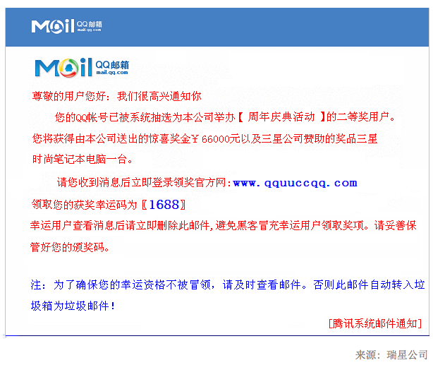 一位李小姐就表示曾經收到過QQ中獎的郵件。網頁中有QQ的LOGO以及詳細的兌獎步驟,按照提示填寫了個人資料以后,該網站就要求李小姐填寫自己的銀行賬號及密碼。這使李小姐警惕起來,仔細一看,網頁顯示的地址并不是騰訊公司的官方頁面,而是www.qquuccqq.com。