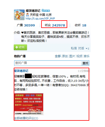 2012-08-23 09:54:13近期,許多網(wǎng)友在騰訊微博上都收聽(tīng)到了這樣一條廣播:“某網(wǎng)購(gòu)網(wǎng)站招聘兼職,輕松在家賺錢(qián),信譽(yù)100%。不收費(fèi),工作自由,收入15-34元/小時(shí)不等。”這條廣告看似不起眼,但是當(dāng)中的“不收費(fèi)”、“工作自由”、“收入15-34元/小時(shí)”等字眼都讓許多尋求兼職的網(wǎng)友怦然心動(dòng)。然而令人意想不到的是,一個(gè)擁有24萬(wàn)粉絲的博主發(fā)布的內(nèi)容,竟然是一個(gè)釣魚(yú)詐騙信息。