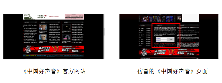 圖2:真假《中國好聲音》網(wǎng)站頁面對(duì)比