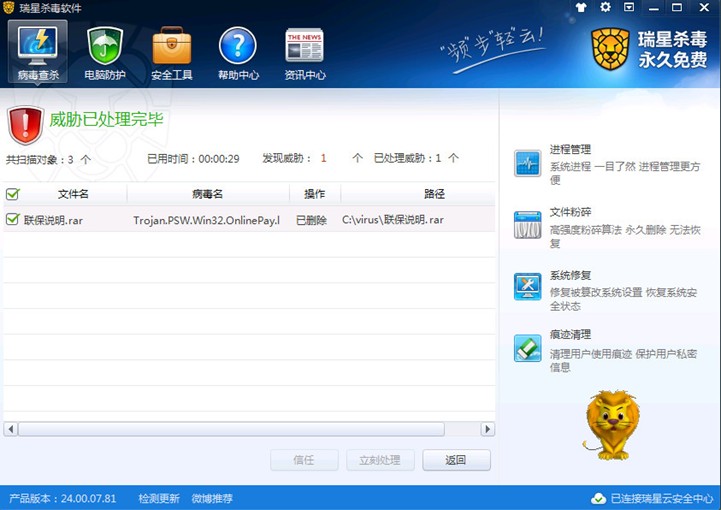圖1:瑞星殺毒軟件V16查殺“聯(lián)保陷阱木馬”