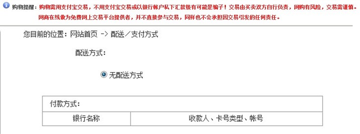 為了使用戶打消疑慮支付錢款,該類網(wǎng)站的支付頁(yè)面在明顯的位置會(huì)有提醒字樣,要求用戶用第三方支付平臺(tái)進(jìn)行錢款交易,然而,當(dāng)用戶進(jìn)入支付頁(yè)面后,卻發(fā)現(xiàn)只能采用網(wǎng)銀直接打款的方式進(jìn)行交易。實(shí)際上,由于該類網(wǎng)站都是欺詐釣魚網(wǎng)站,無(wú)法得到第三方支付平臺(tái)的認(rèn)證,所以只能采取網(wǎng)銀支付的形式,于是才出現(xiàn)了支付流程中前后矛盾的內(nèi)容,使其原形畢露。
