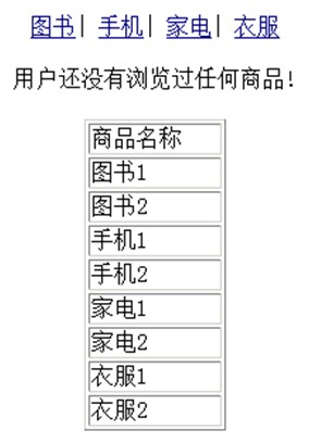 當(dāng)用戶初次訪問(wèn)頁(yè)面時(shí),因?yàn)槌绦驔](méi)有記錄客戶端用戶訪問(wèn)的相應(yīng)感興趣的產(chǎn)品信息,所以顯示內(nèi)容為“用戶還沒(méi)有瀏覽過(guò)任何商品!”,如下圖1所示。
