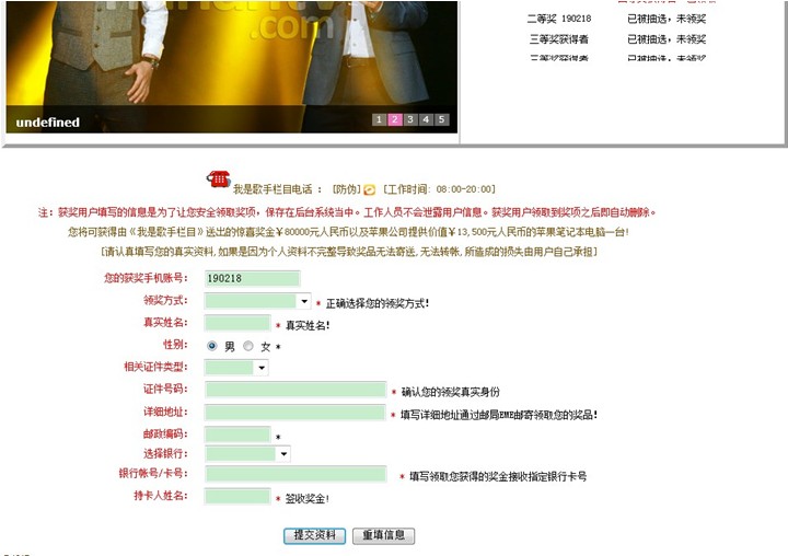 黑客以《我是歌手》欄目組的名義向用戶發(fā)送釣魚(yú)中獎(jiǎng)信息,并注明該用戶為場(chǎng)外抽取的幸運(yùn)觀眾,可獲得高達(dá)8-10萬(wàn)元不等的獎(jiǎng)金及價(jià)值萬(wàn)元的蘋果筆記本電腦一臺(tái)。該信息附帶4位數(shù)的驗(yàn)證碼。網(wǎng)民如想進(jìn)入領(lǐng)獎(jiǎng)頁(yè)面,必須填入這4位數(shù)驗(yàn)證碼才可通過(guò),這種看似“正規(guī)”的流程,讓用戶誤以為這是一個(gè)正規(guī)的網(wǎng)站,而黑客就是以此來(lái)騙取用戶的信任。