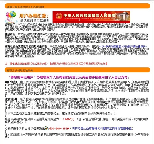 當(dāng)用戶成功提交資料后,網(wǎng)站上會(huì)出現(xiàn)鄭重聲明等字樣,提示用戶如果不在規(guī)定時(shí)間內(nèi)辦理相關(guān)領(lǐng)取手續(xù),則會(huì)根據(jù)此前提供的個(gè)人信息對(duì)用戶提起訴訟,并要求賠償數(shù)萬(wàn)元的違約金。黑客以此來(lái)對(duì)用戶進(jìn)行恐嚇,其手段極其惡劣。同時(shí),黑客還會(huì)以獎(jiǎng)金獎(jiǎng)品的轉(zhuǎn)賬及運(yùn)輸風(fēng)險(xiǎn)抵押金為名,讓用戶匯款幾千甚至上萬(wàn)元到指定賬戶,并標(biāo)注此費(fèi)用在領(lǐng)取獎(jiǎng)品后全數(shù)返還。瑞星安全專家介紹,這是黑客慣用的伎倆,一旦用戶匯款,黑客就會(huì)溜之大吉。