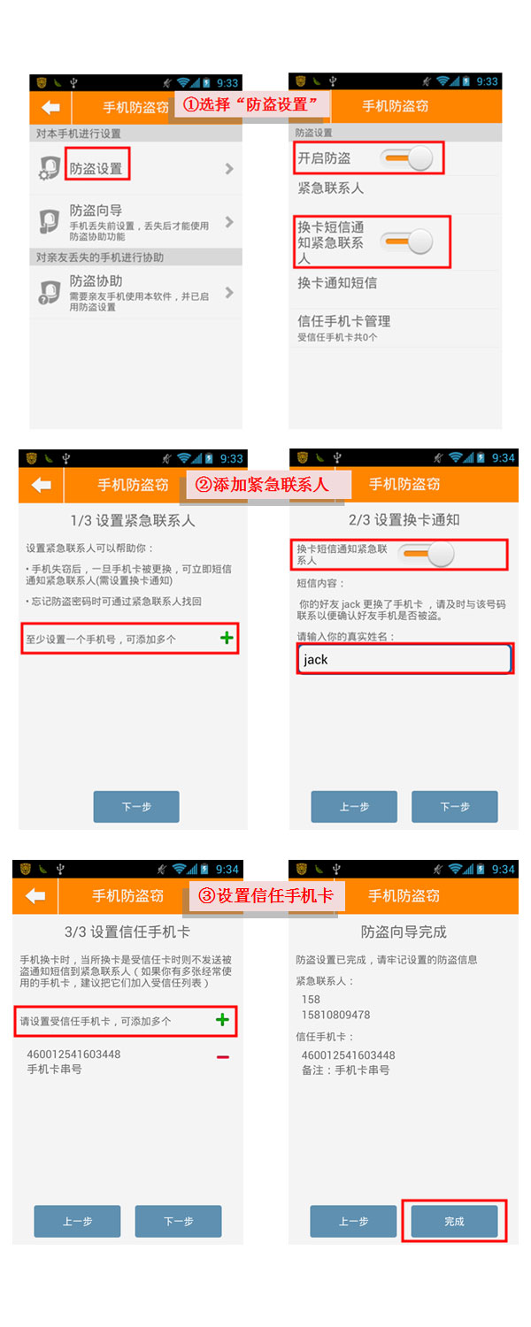 圖2:經(jīng)過幾個(gè)簡(jiǎn)單的步驟,就完成了對(duì)瑞星手機(jī)安全軟件防盜功能的設(shè)置