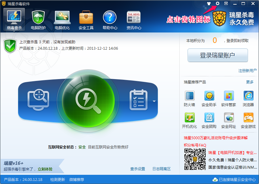 2、點(diǎn)擊瑞星殺毒軟件右上角的“齒輪”圖標(biāo),打開(kāi)“瑞星設(shè)置中心”。
