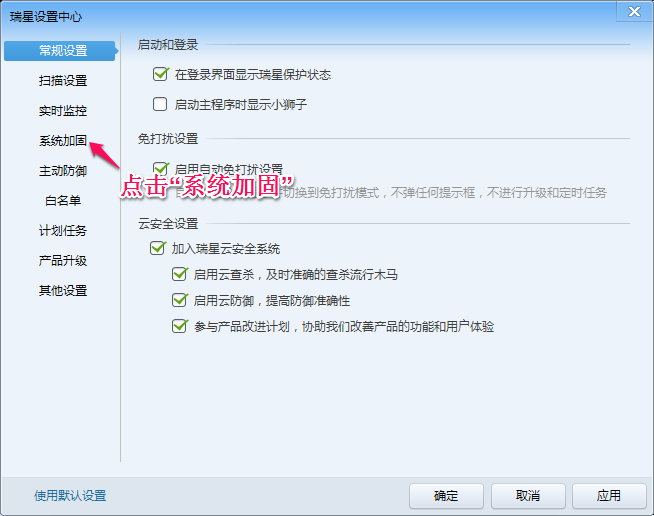 3、點(diǎn)擊瑞星設(shè)置中心左側(cè)的“系統(tǒng)加固”。
