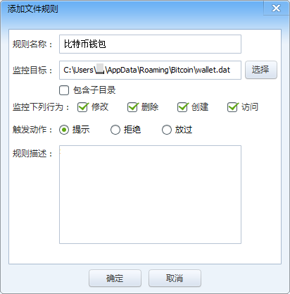6、規(guī)則名稱填入“比特幣錢(qián)包”,監(jiān)控目標(biāo)輸入比特幣錢(qián)包文件的完整路徑。(Windows XP默認(rèn)路徑為:C:\Documents and Settings\[Windows登陸用戶名]\Application Data\Bitcoin\ wallet.dat;Windows Vista、7、8、8.1的默認(rèn)路徑為:C:\Users\[Windows登陸用戶名]\AppData\Roaming\Bitcoin\wallet.dat。“監(jiān)控下列行為”中的四項(xiàng)全部選定,并將“觸發(fā)動(dòng)作”選擇為“提示”,然后點(diǎn)擊“確定”按鈕。