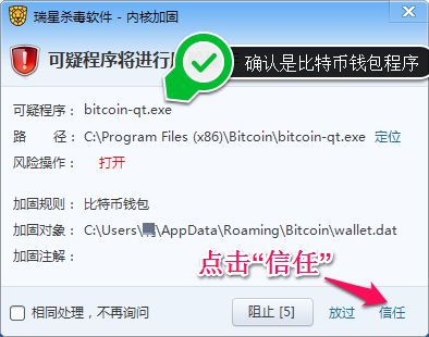 7、打開(kāi)比特幣錢(qián)包程序,瑞星殺毒軟件會(huì)立即彈出提示框。請(qǐng)確認(rèn)該提示框中的可疑程序?yàn)楸忍貛佩X(qián)包程序(如本例中的bitcoin-qt.exe),然后點(diǎn)擊提示窗中的“信任”。