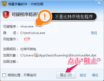 8、至此,您的比特幣錢(qián)包數(shù)據(jù)已經(jīng)被瑞星保護(hù)。若瑞星彈出加固規(guī)則為“比特幣錢(qián)包”的窗口,并且可疑程序不是比特幣錢(qián)包程序時(shí),建議點(diǎn)擊“阻止”。